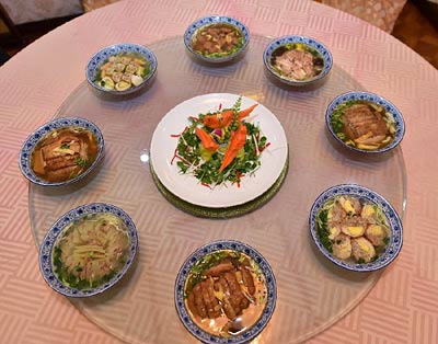 年味渐浓,山西汾阳的传统美食“汾州八大碗”唱起了酒店和家庭宴请的主角。 “汾州八大碗”以猪肉、羊肉、鸡肉为主料,搭配鸡蛋、白菜、豆腐等辅料,通过煎、炸、蒸、烧等烹饪程序精制而成,对厨师的刀功、火候、调料搭配都有很高的要求,制作一桌“八大碗”往往需要多位厨师合作三、四个小时。 2009年,“汾州八大碗”被评为山西省非物质文化遗产保护项目。