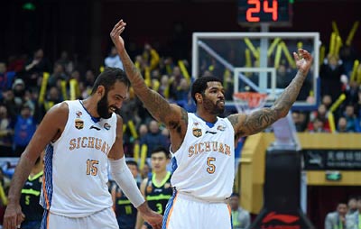 全明星周末过后,2016-2017赛季中国男子篮球职业联赛(CBA)11日迎来第26轮的9场比赛,缺少易建联的广东队在客场以109:130大比分不敌卫冕冠军四川队,“领头羊”上海115:84成功“复仇”吉林,终止两连败。图为四川品胜队球员在比赛中庆祝得分。