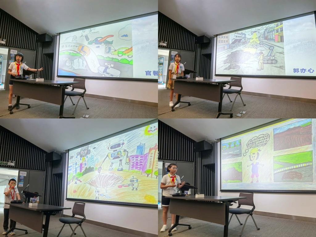 在作品展示与交流环节,小朋友们纷纷展示了精心创作的绘画作品,并通过简短的汇报,将自己对地面塌陷灾害及其防控治理的理解融入富有创意的表达中。尤其是在科技与人工智能治理灾害方面,孩子们的构想充满奇思妙想与趣味性,从智能防治到AI预警系统,一幅幅作品不仅展现了他们独特的创造力,也传递出对防灾减灾的深刻思考。评委老师们对作品逐一点评,肯定了孩子们的创意与思考,现场掌声不断。这些童趣盎然、巧思满满的作品赢得了家长们的一致好评。