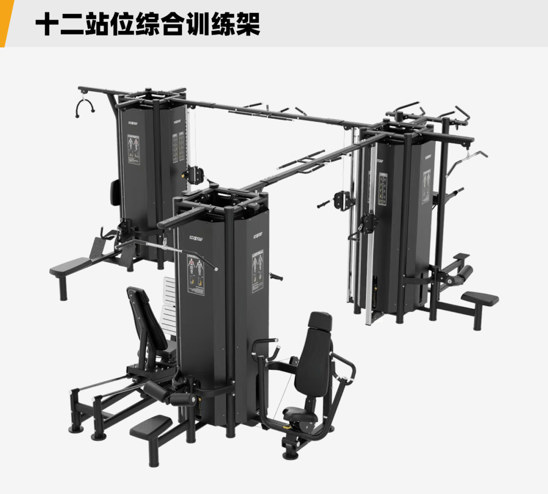 作为本次展出的重点产品之一,十二站位综合训练架是驰健INSIGHT为现代商业健身房量身打造的器材解决方案。
